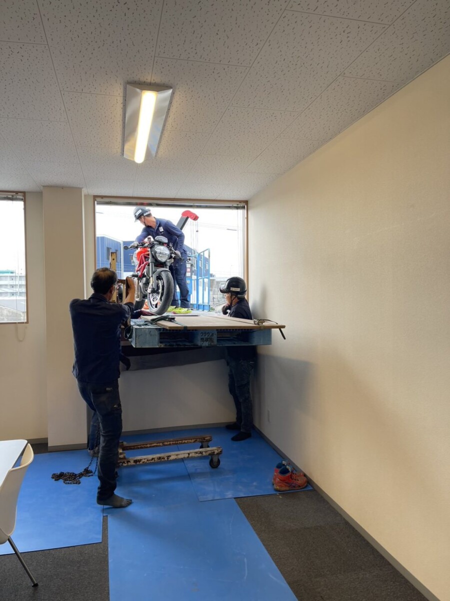 前社長のバイクを本社会議室に展示する為、作業車を使用し、安全確認をしながら搬入していきます。