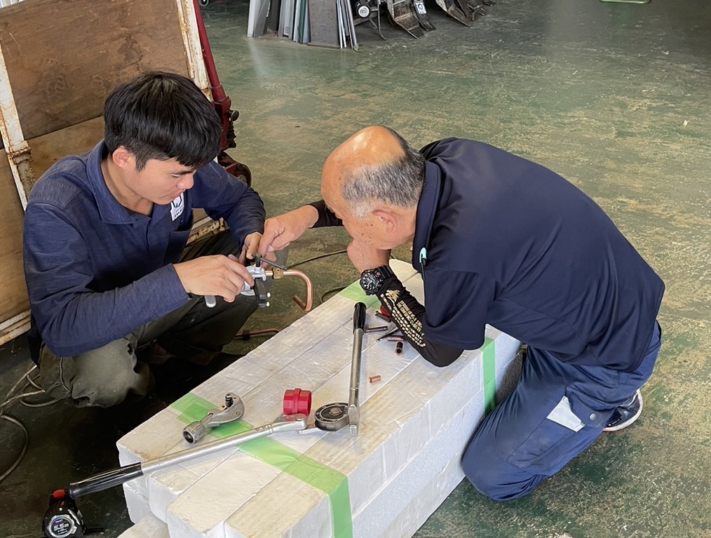 仕事の合間に先輩から技術を指導してもらっているようです。